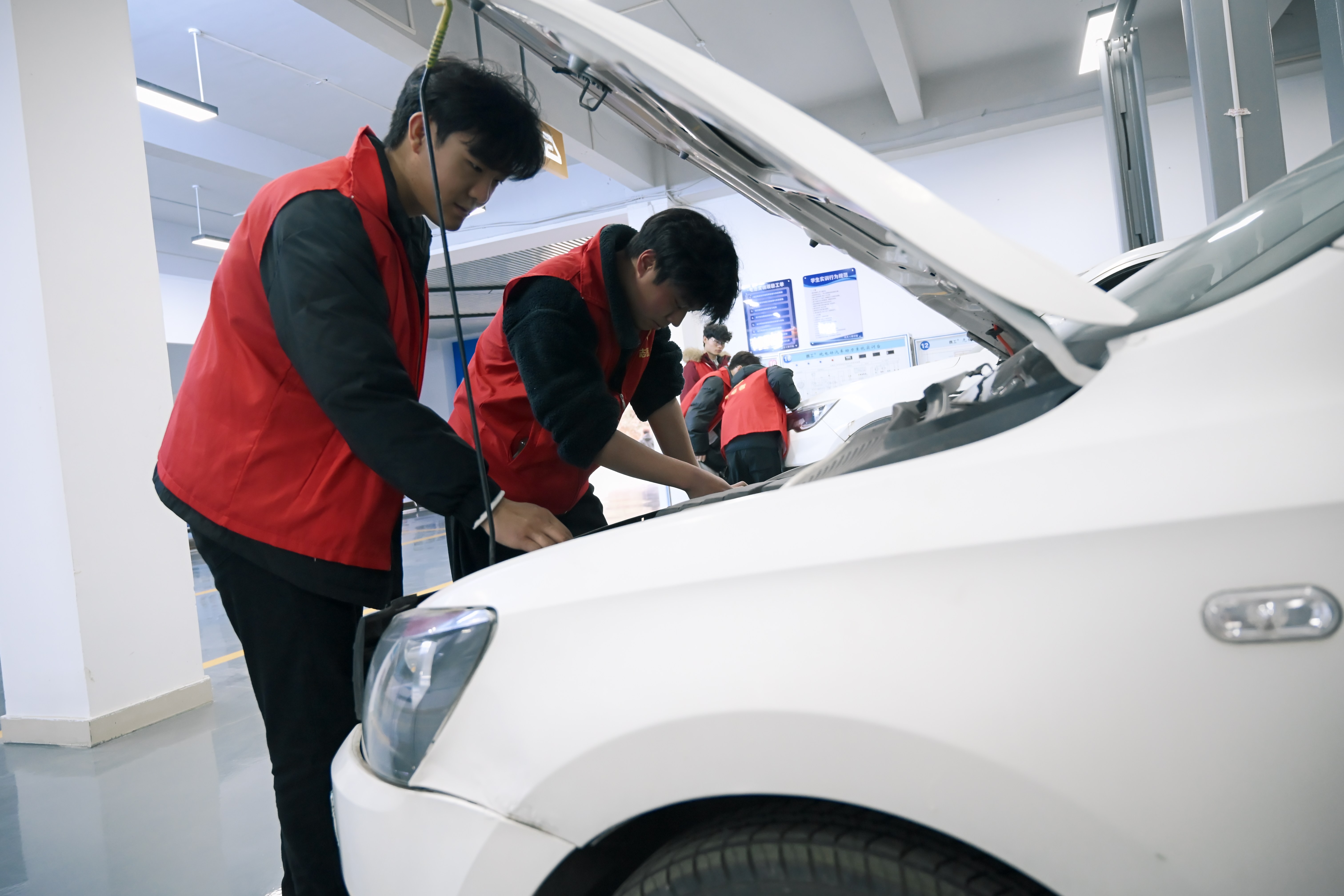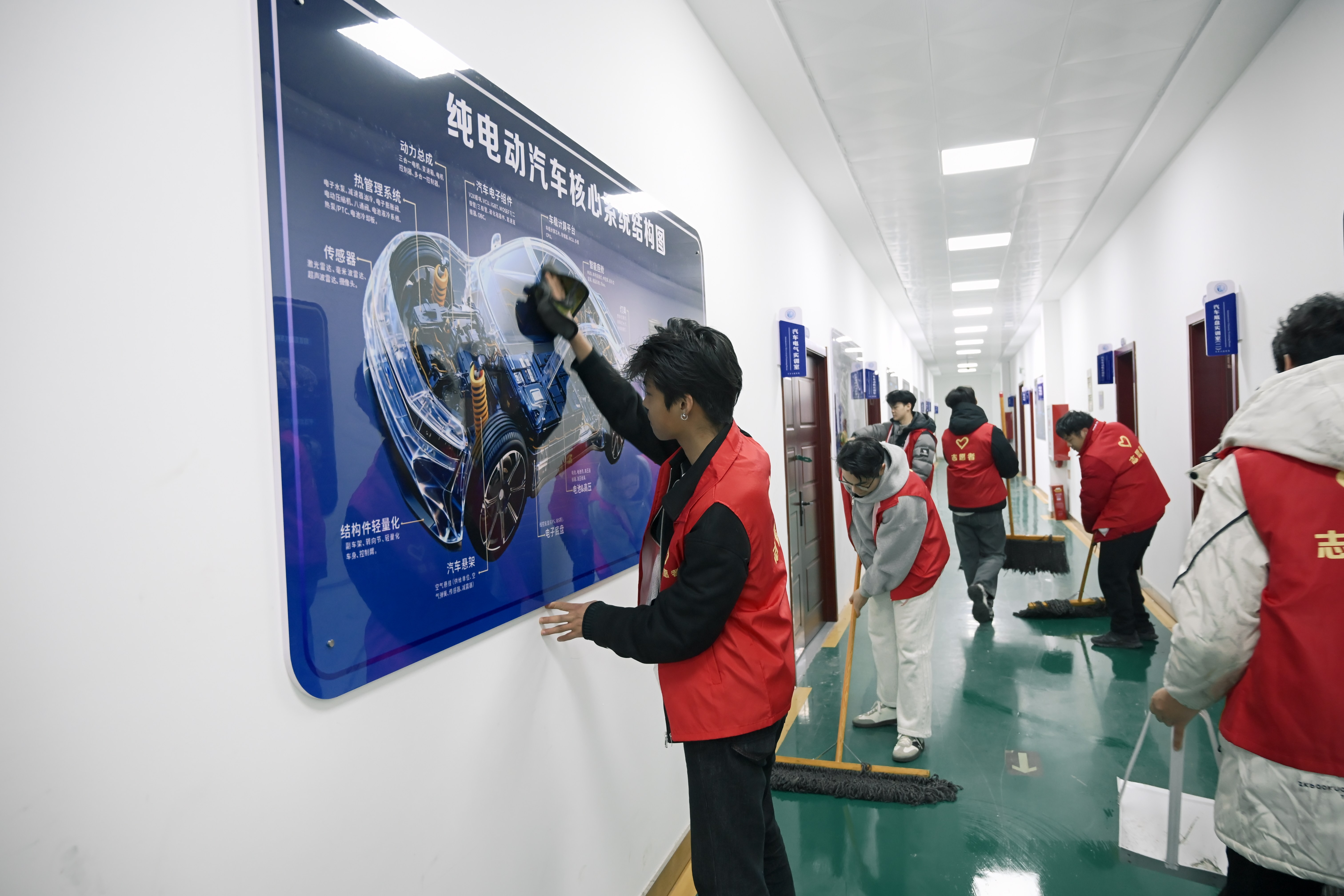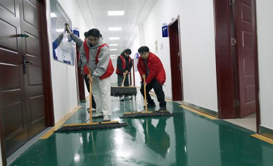 校园内,同学们立足专业,对实训车间进行深度清洁维护,在劳动中锤炼工匠精神。